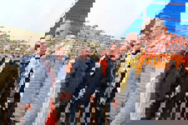 sembolü olan bezlerden dağıttı. Protokol üyeleriyle birlikte alandaki kalabalığa hitap eden